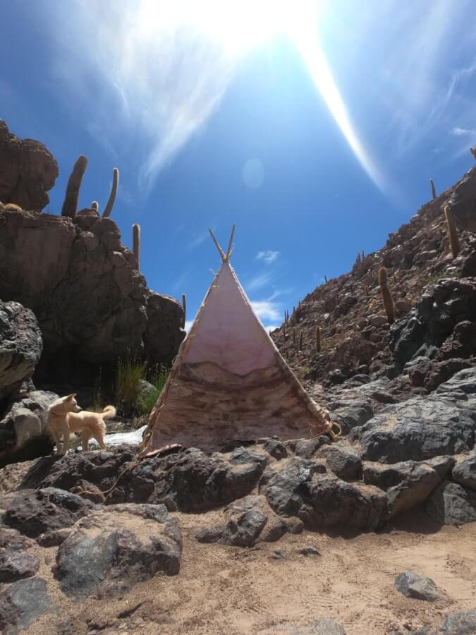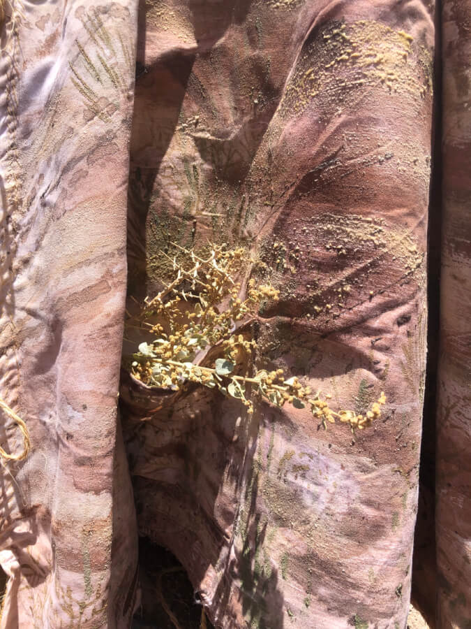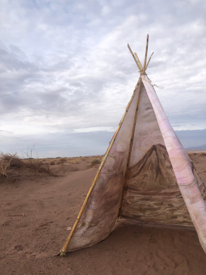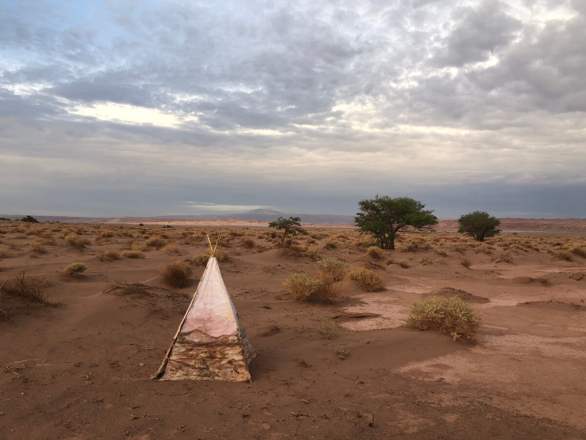 Dat deze oeroude plaats bar is en dat je je als mens tegen zon en wind moet beschermen is een gegeven en tegelijkertijd biedt juist de leegte de mogelijkheid tot iets nieuws. Ik besloot een mobiele ruimte te maken om in te schuilen én op te gaan in de omgeving; een ruimte die geen sporen achterlaat in het landschap, beschilderd met alle verzamelde kleuren in steen pigmenten én plant inkten.